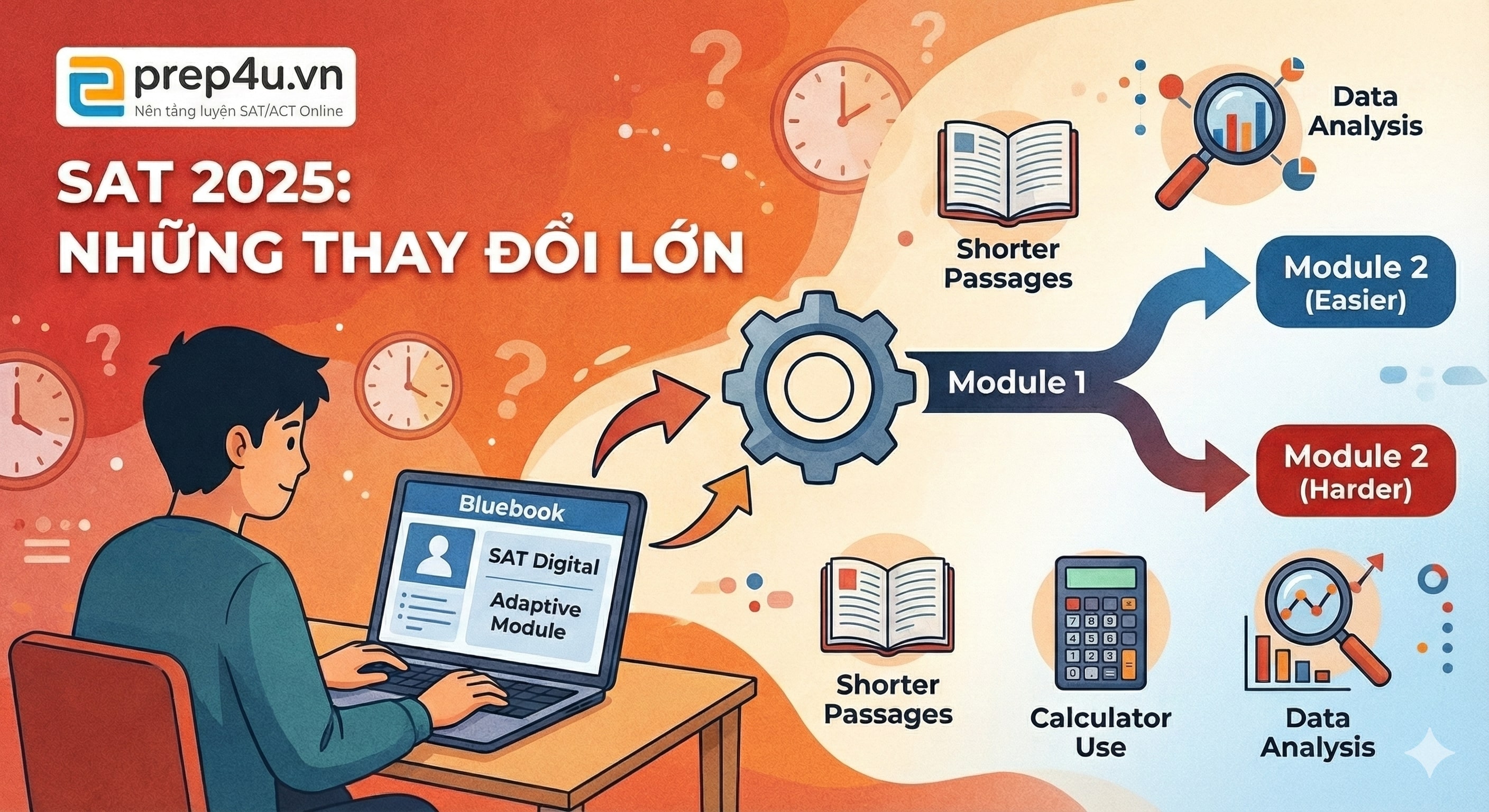 Cập nhật đầy đủ thay đổi SAT 2026: cấu trúc mới, thi digital, adaptive module và cách tính điểm. Xem phân tích chi tiết & luyện thử đề chuẩn SAT Digital.